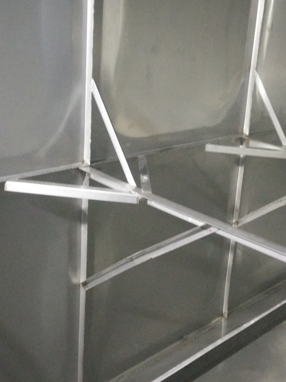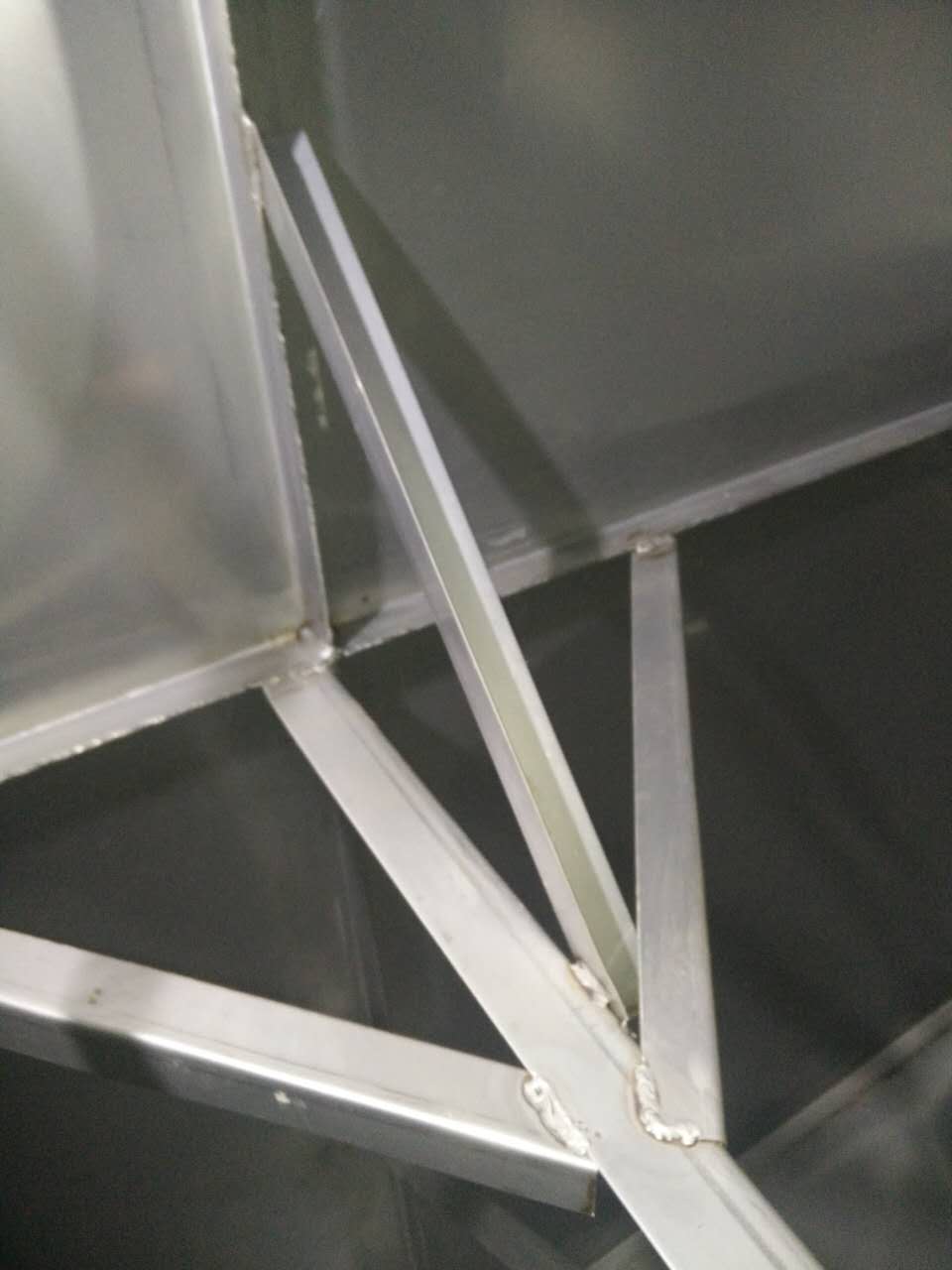 主拉主要作用是防止水箱變形,厚度一般采用靠近底板的側板厚度為基準,規格為4cm*4cm。其焊接間距一般為1000mm一條,大型水箱特別是高度超過3米以上的。其間距應該為500mm一條,連接處必須進行滿焊處理。