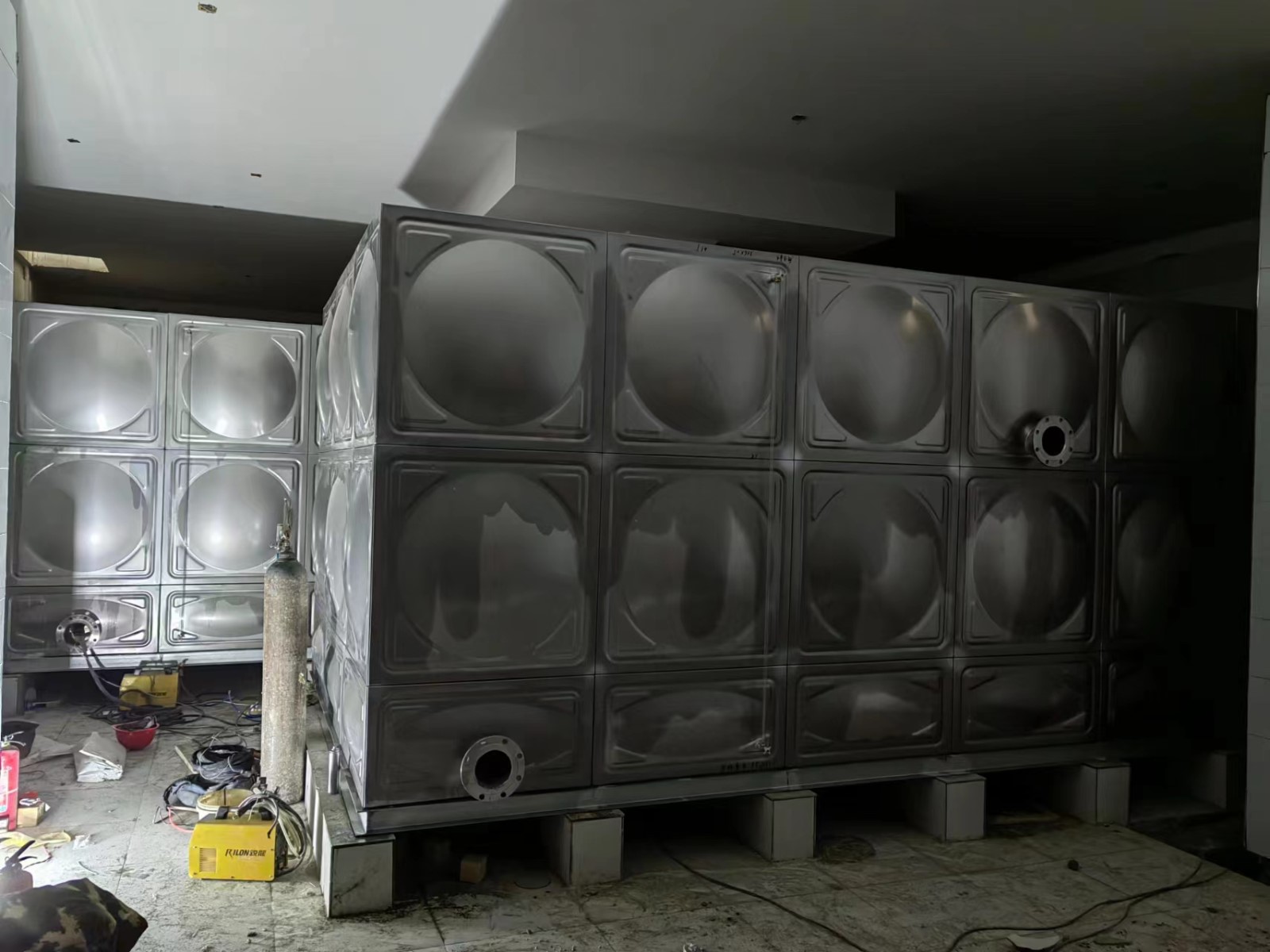 我司承接的河北省河北省廊坊市遠洋琨庭給水項目已安裝試水完畢,此水箱用作給水泵房水箱使用。不銹鋼水箱內部結構包括:水箱框架、焊接管、水管、閥門、填料、蓋板、隔板、排水孔(上中下)和其它附件。不銹鋼水箱一般由框架結構和焊接管兩部分組成,其中框架結構包括:箱體及周圍的密封墊,箱體內部的隔板及隔板固定螺絲,支架及支架固定螺絲,進出水管,出水閥門等。