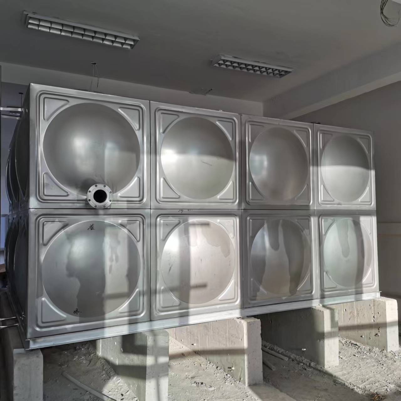 我司承接的河北省石家莊市長安區第九十三中學,不銹鋼水箱項目已完工。不銹鋼水箱采用SUS304、SUS316L、SUS444等不銹鋼板,沖壓成型。一般沖壓成三種尺寸,分別是1x1米、1x0.5米和0.5x0.5米三種,周邊用鎢極氬弧焊接,具有強度高、重量輕、成本低、環保衛生等特點。